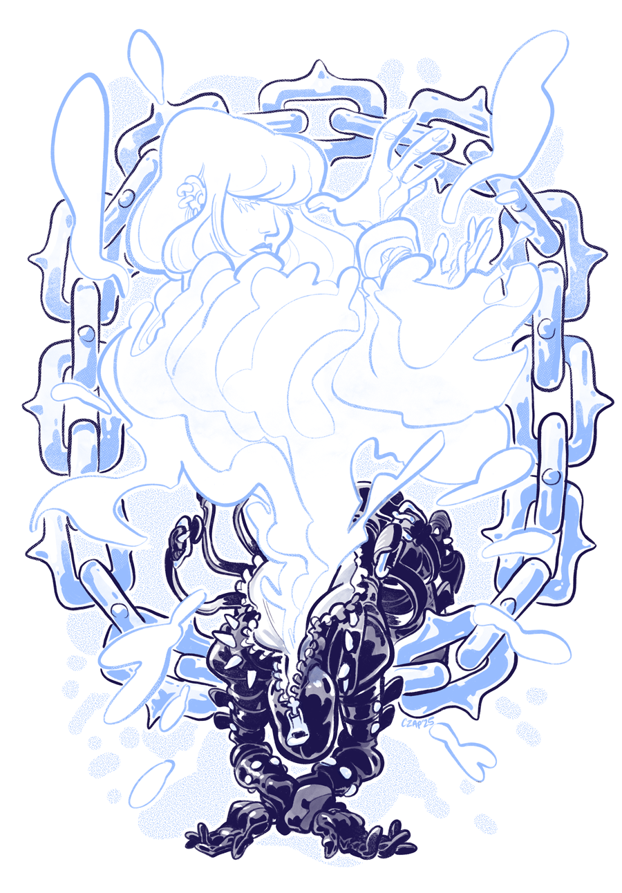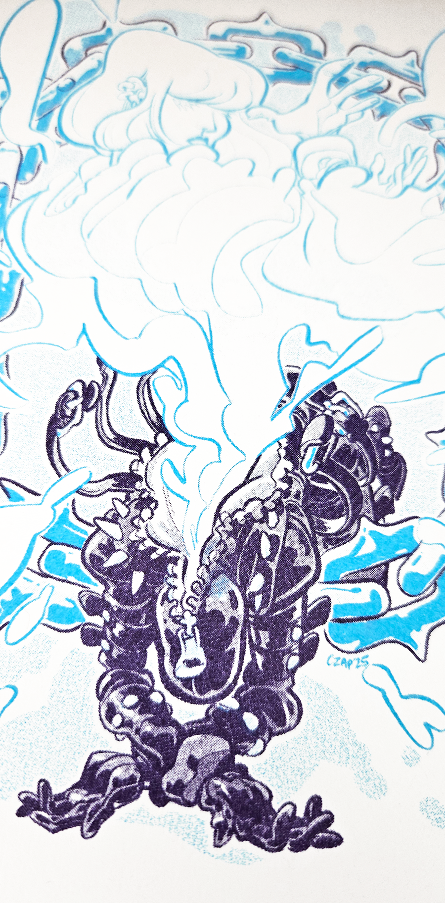Half-letter sized risograph print inspired by "One to Remember" in Monsters in Love #4.